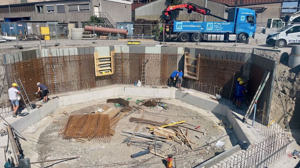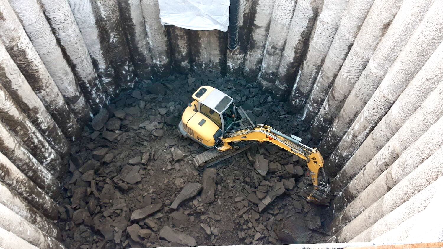 Dominik, Bauleiter und Prokurist bei BT Bau, steht am Rand eines Schachtes mit zwölf Metern Durchmesser. 23 Meter geht es hier senkrecht in die Tiefe. Und genau dort unten beginnt der sogenannte Microtunnel – eine unterirdische Verbindung zwischen vier Schächten, durch die später Strom für einen neuen Elektrohochofen fließen wird.